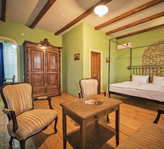 Отель находится в городе Телави, в винодельческом регионе Алазанской долины. Номера отеля Chateau Mere оформлены в классическом стиле и обставлены антикварной мебелью.